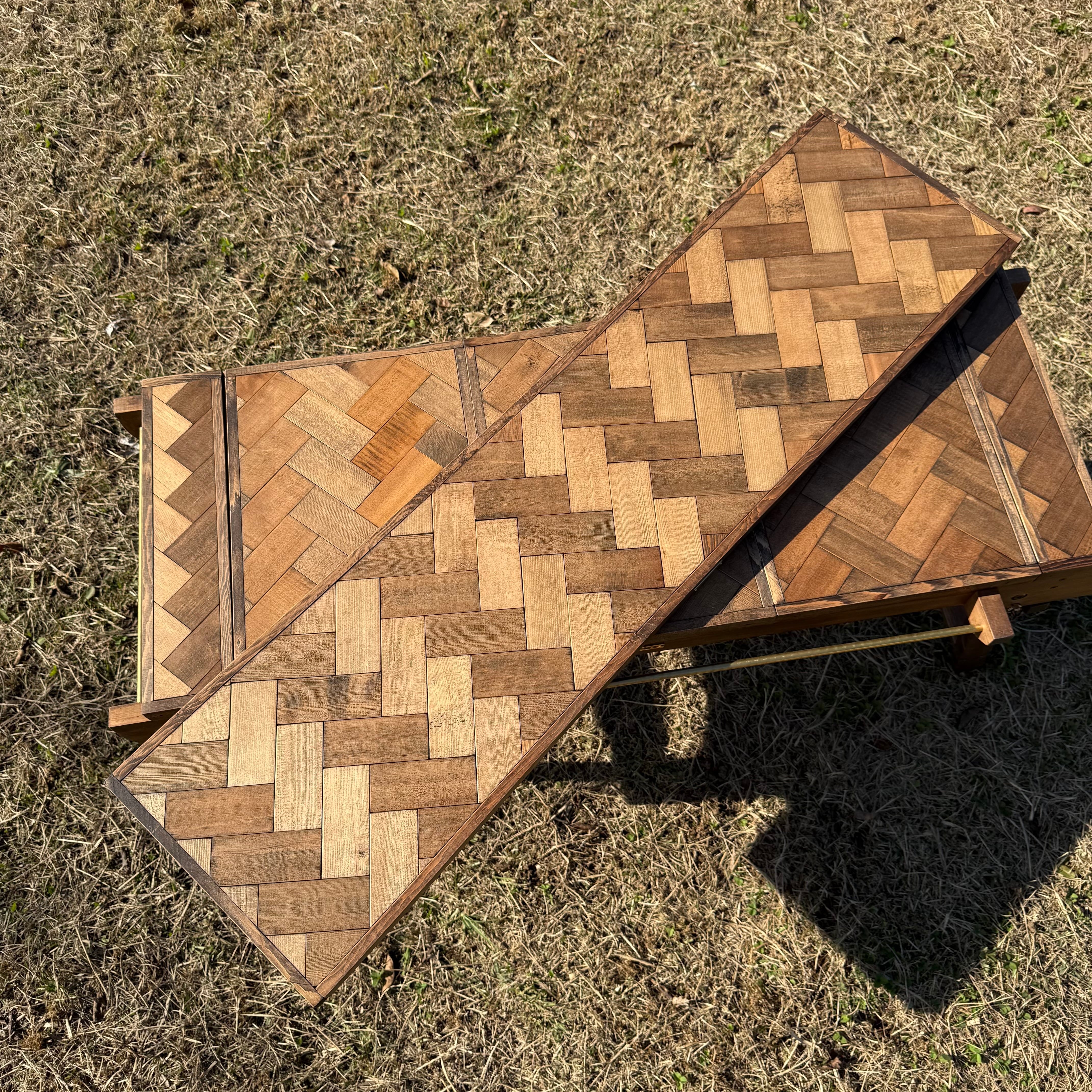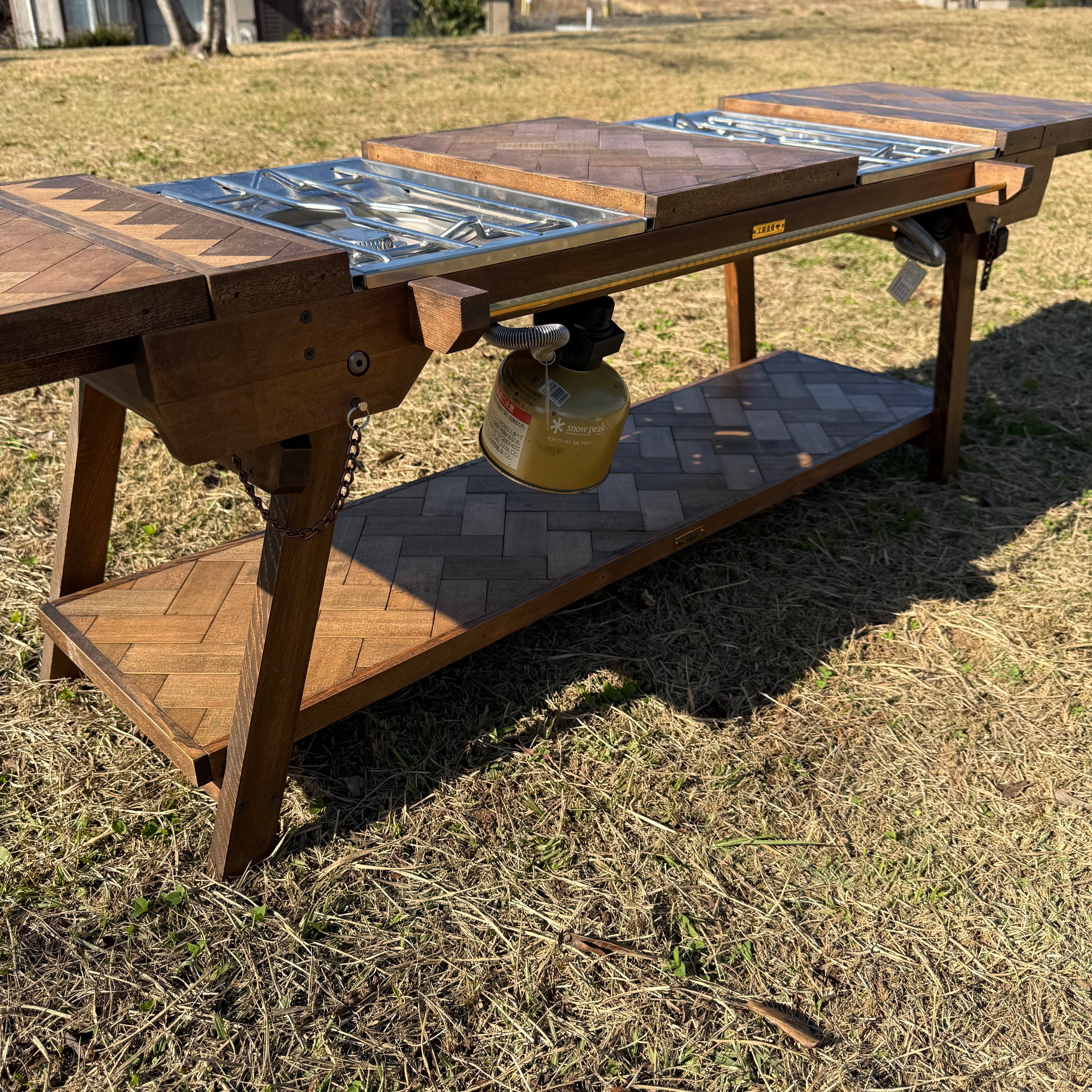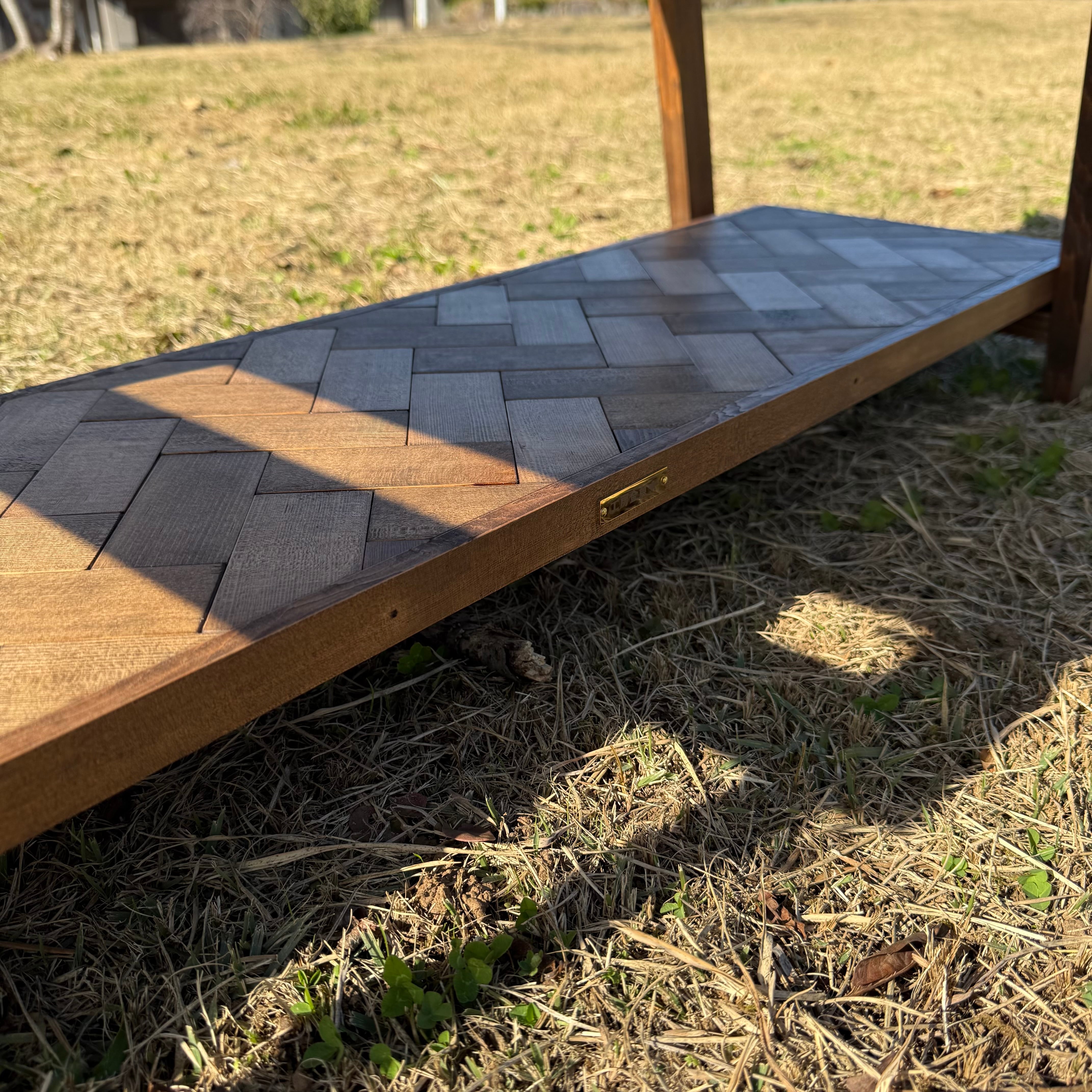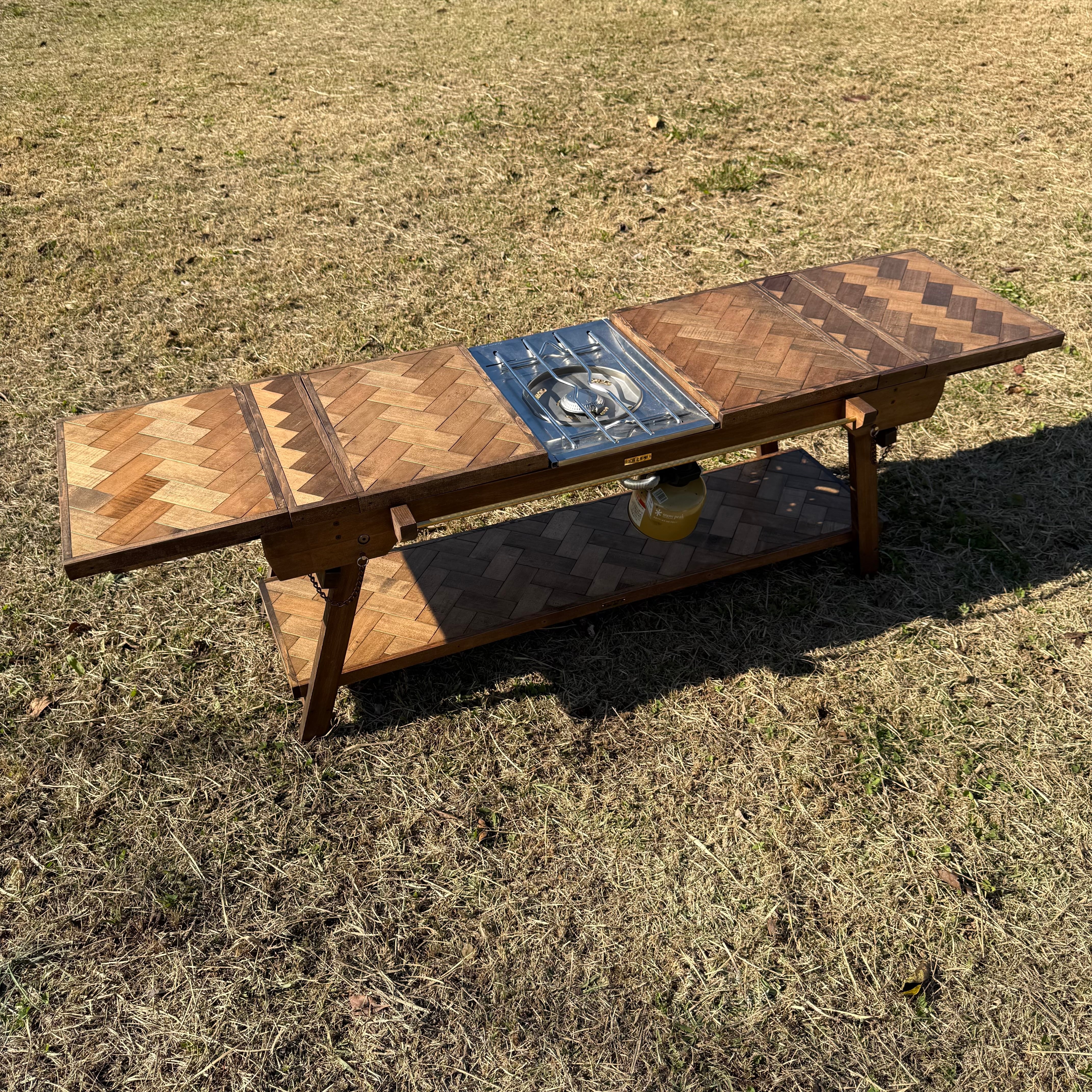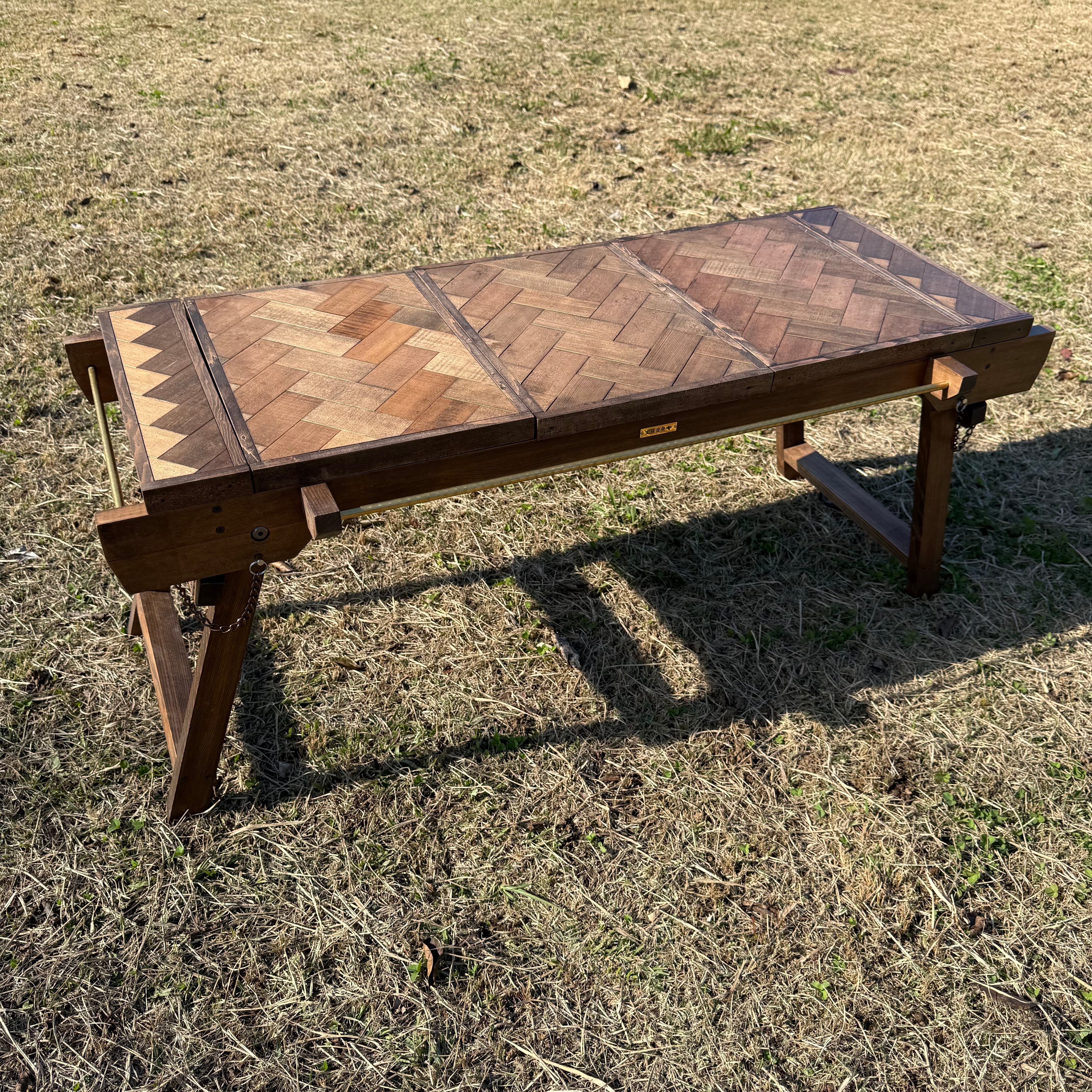 アウトドアやキャンプシーンで注目のヘリンボーン柄が美しい折りたたみ式ローテーブル。
