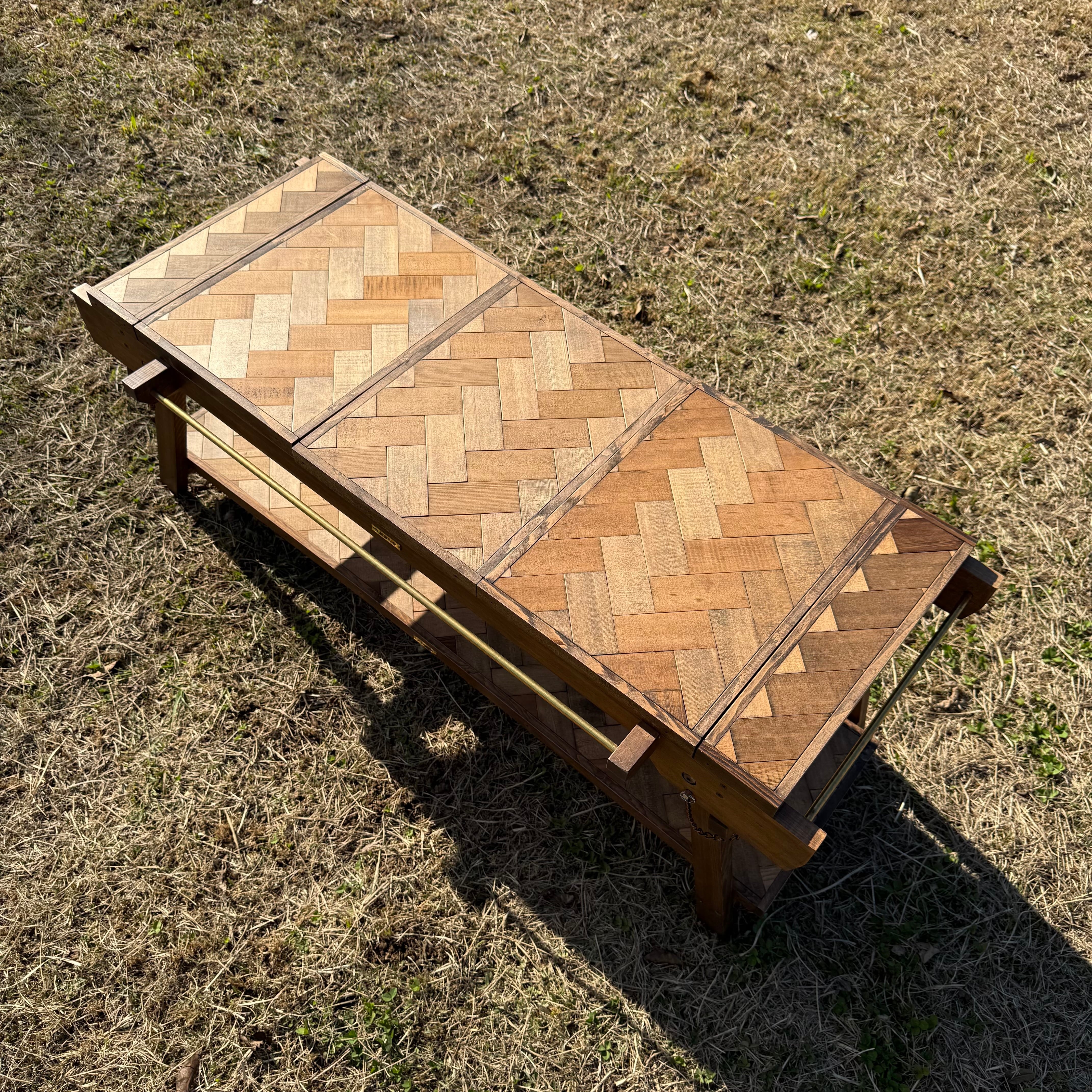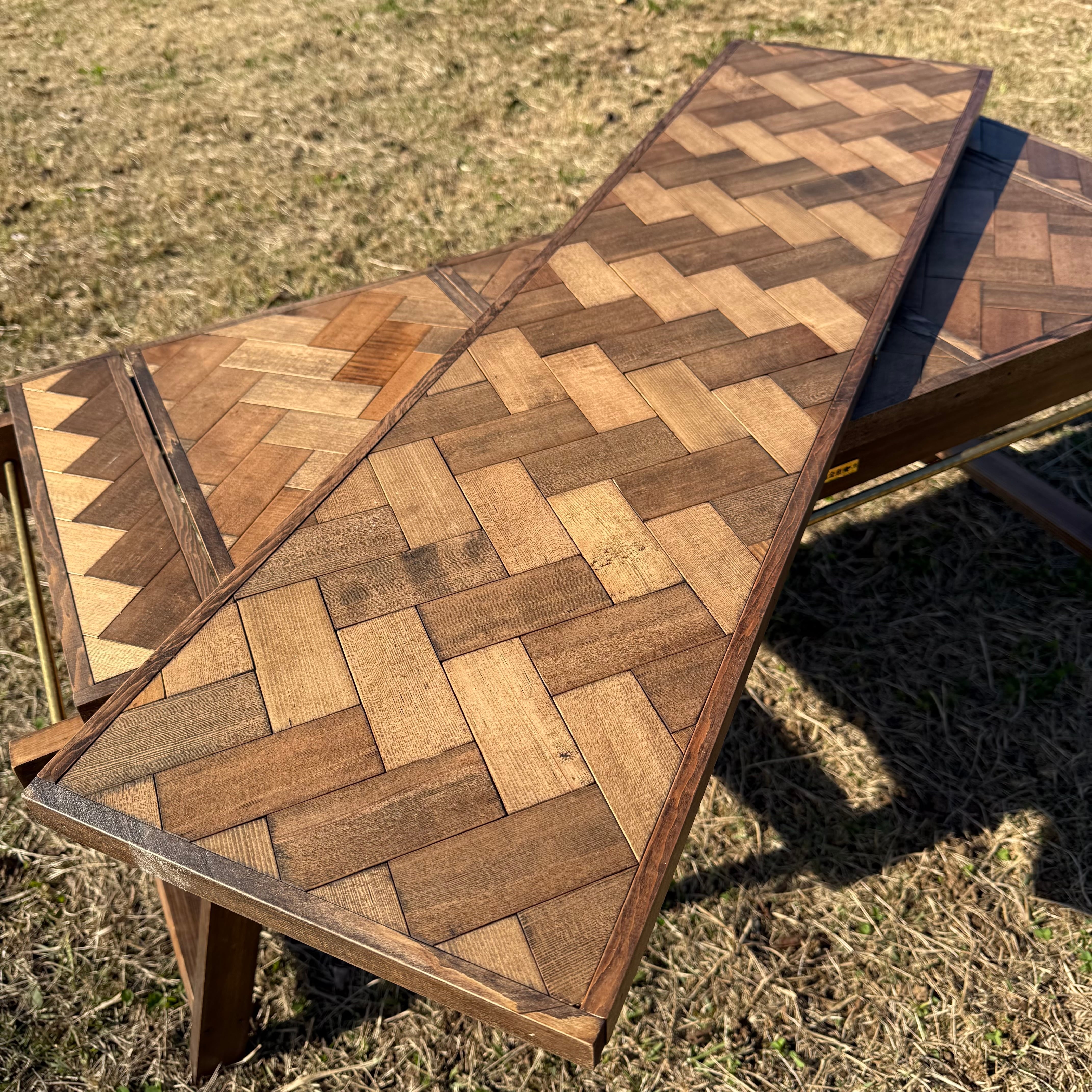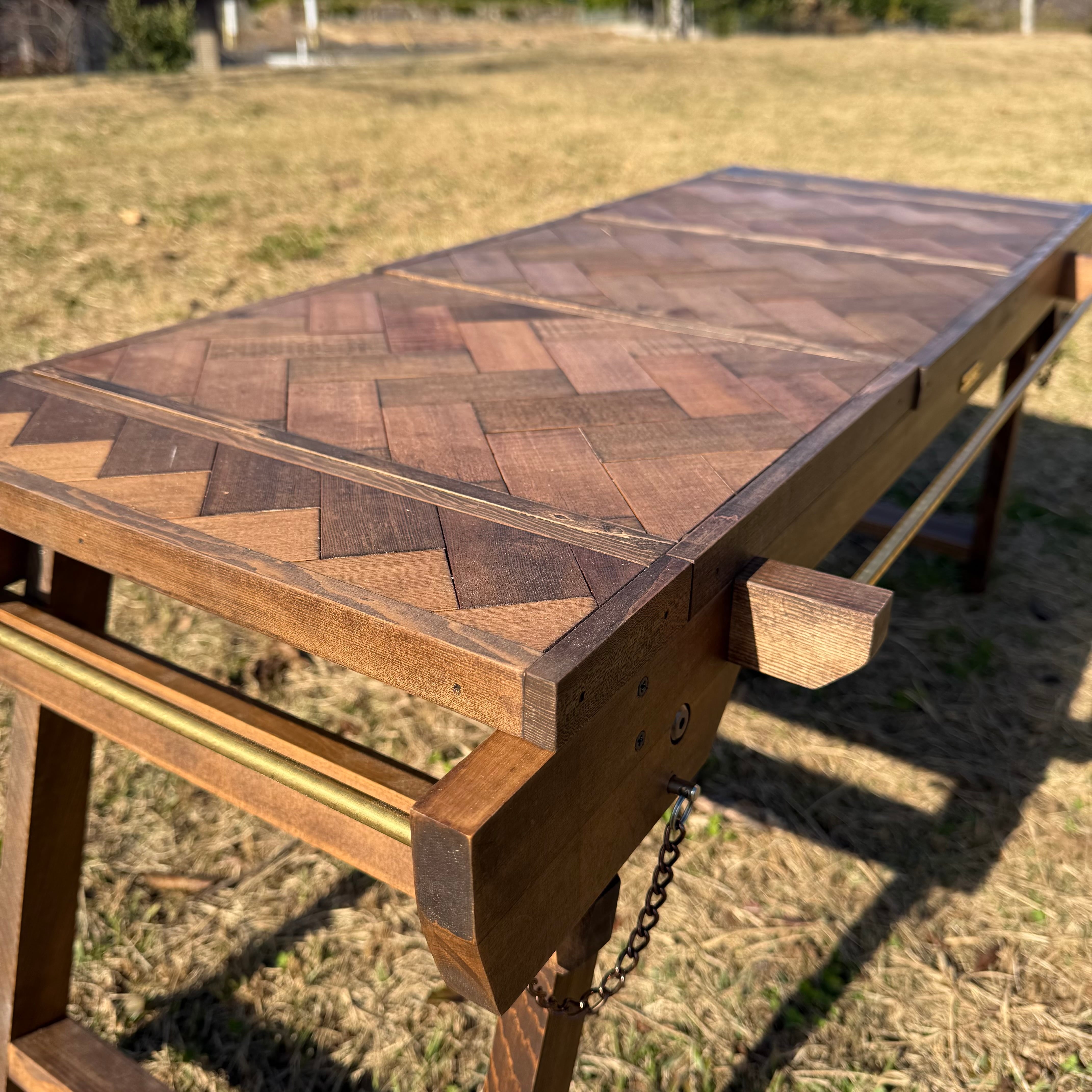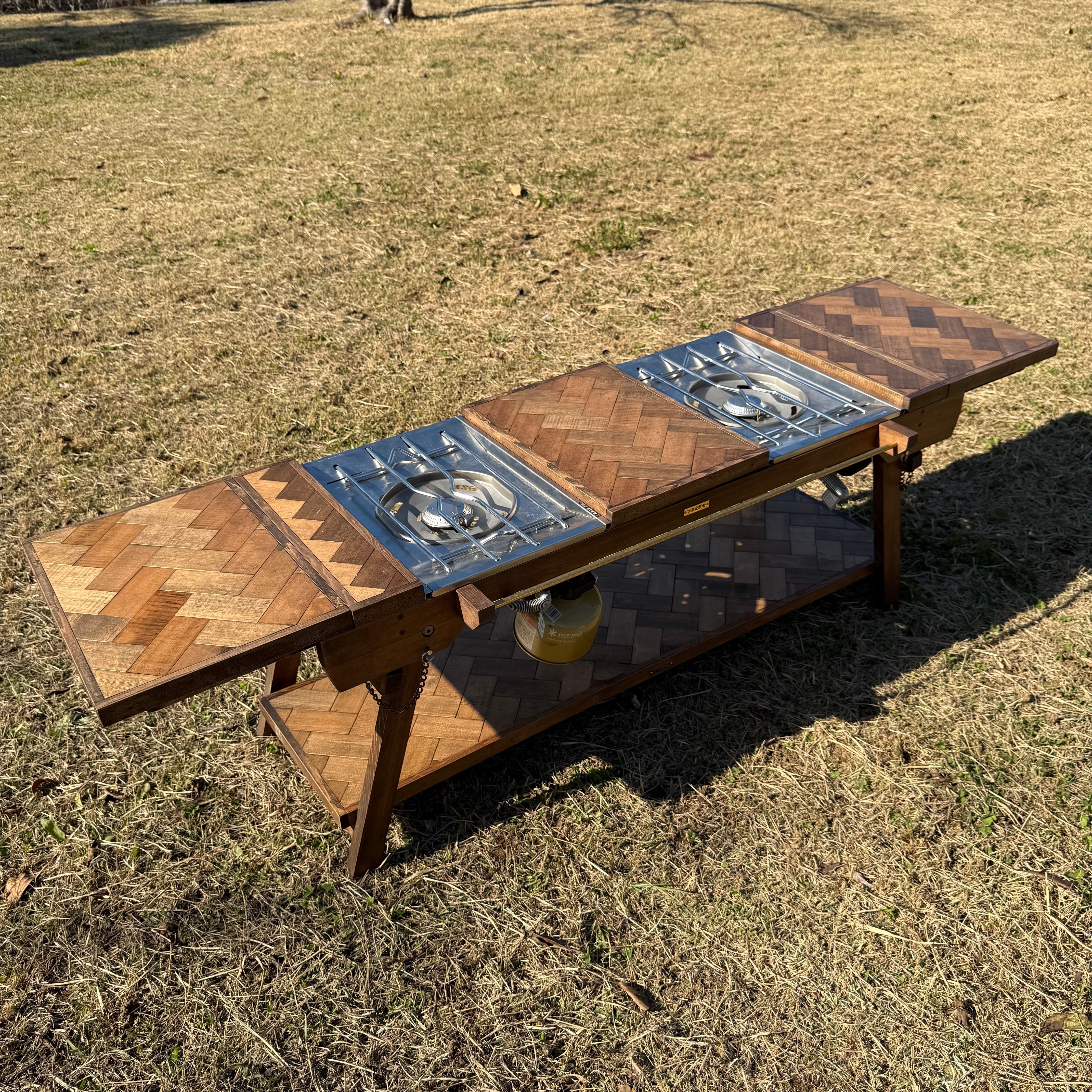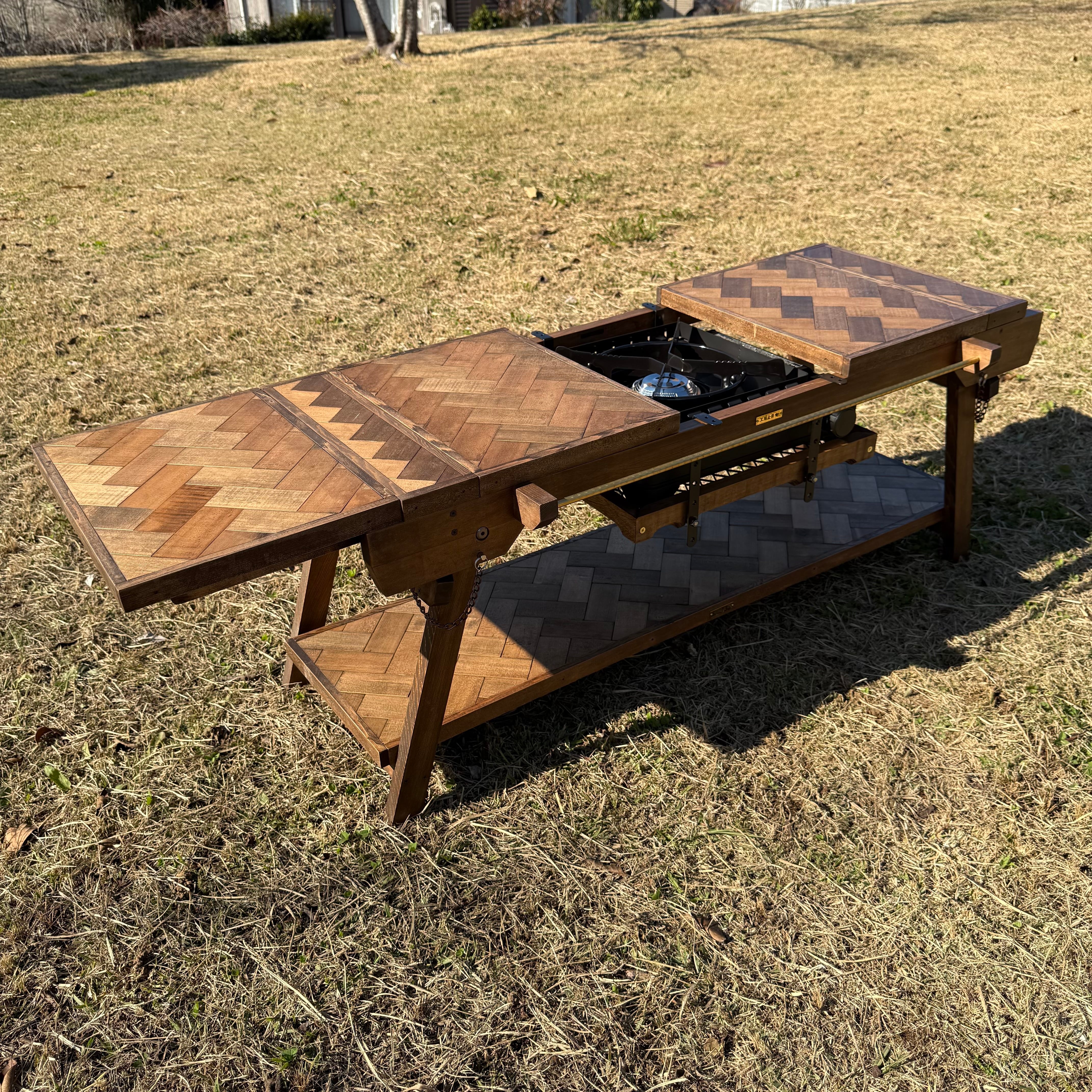 アウトドアやキャンプシーンで注目のヘリンボーン柄が美しい折りたたみ式ローテーブル。